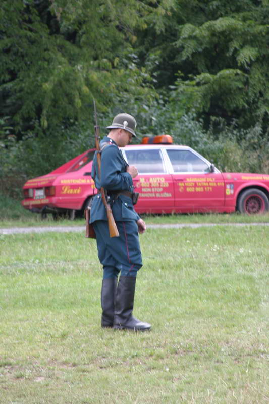 V prostoru mezi vystavenými exponáty se pohyboval četník v dobové uniformě a výzbroji z první republiky.