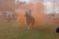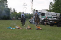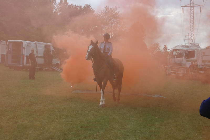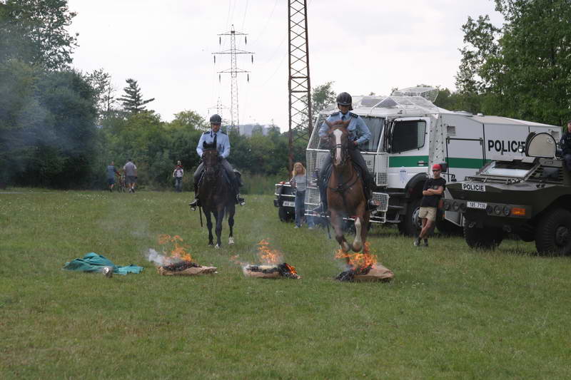 Ukázka výcviků koní probíhání dýmovnicemi a přeskok ohně.